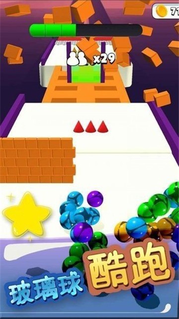 玻璃球跑酷中玩家可以体验到各种刺激有趣的冒险模式,玩家进入到游戏中可以在不一样的赛道上使用玻璃球完成各种挑战,玩家在游戏中闯过关卡就可以获得奖励,玻璃球的数量越多碰到各种障碍的时候就会更好的越过。