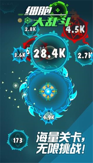 细胞大乱斗游戏玩家需要控制你的细腻去吞噬更多比自己小的细胞,使自己变得更加的强大,收集大量的材料和资源来快速提升自己细胞的力量,只有足够的强大才能让你所向披靡,完成一关又一关的挑战哟。